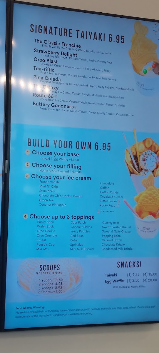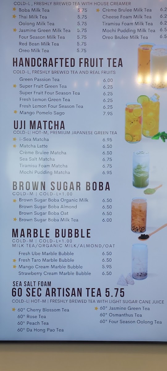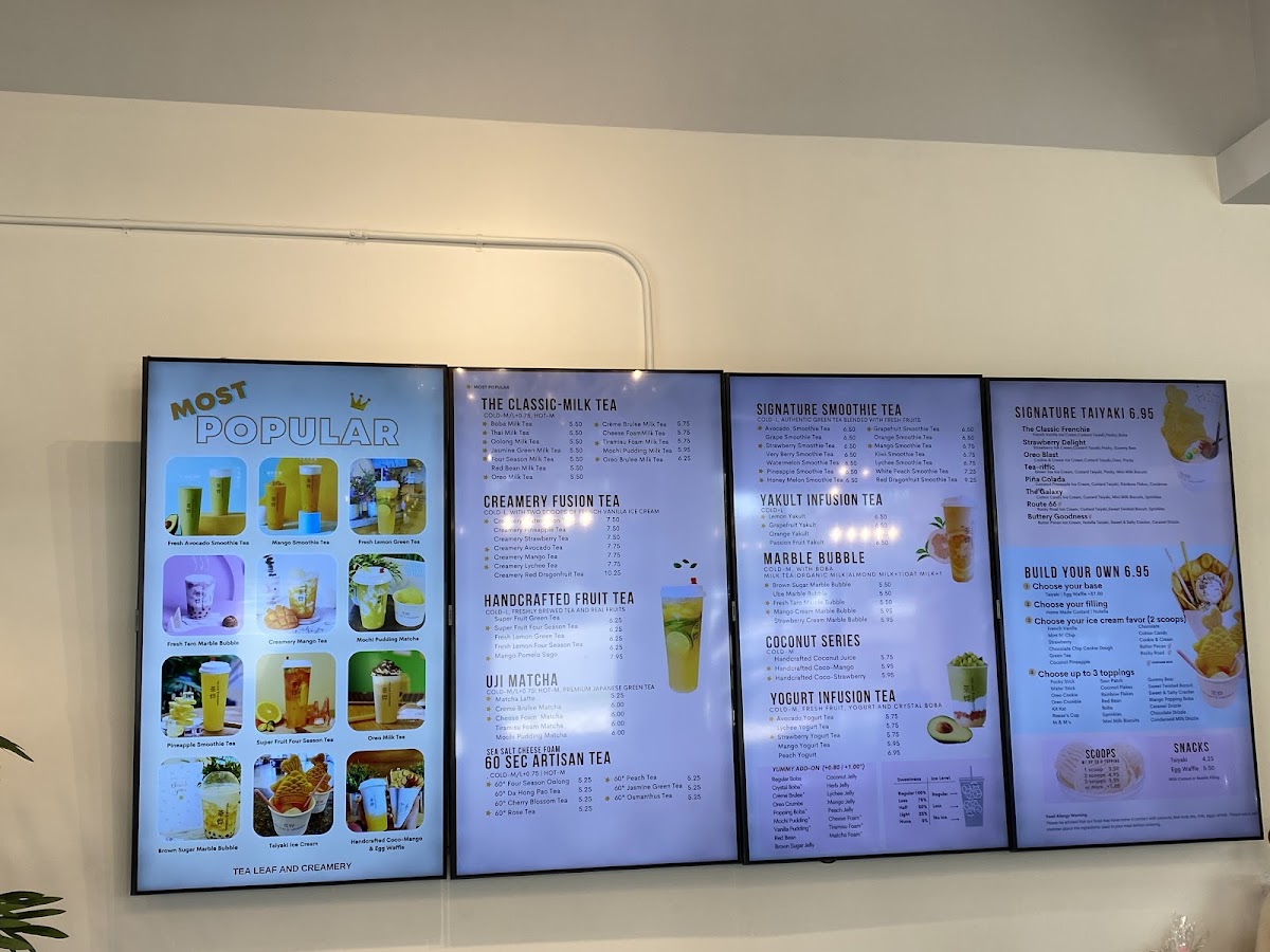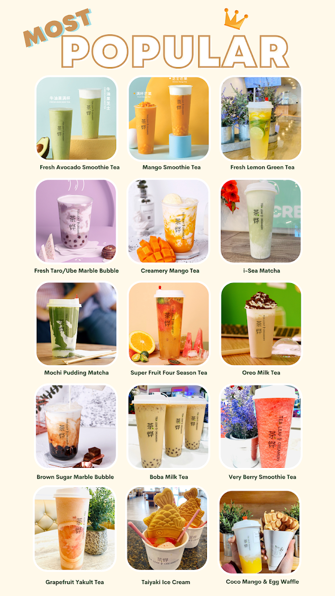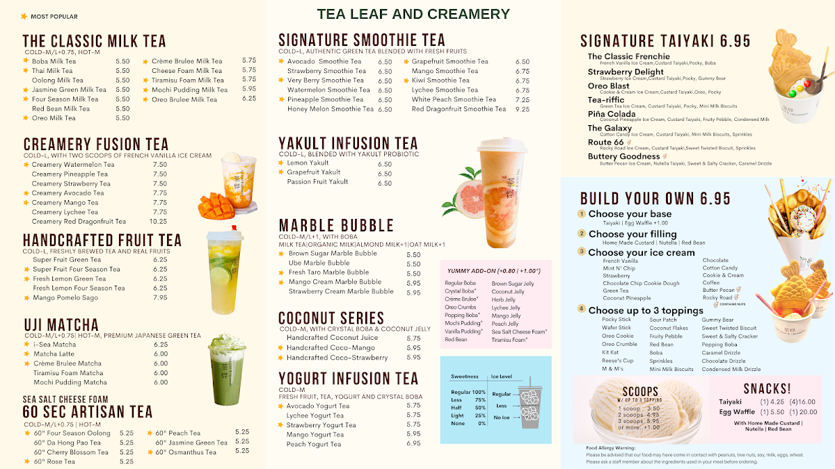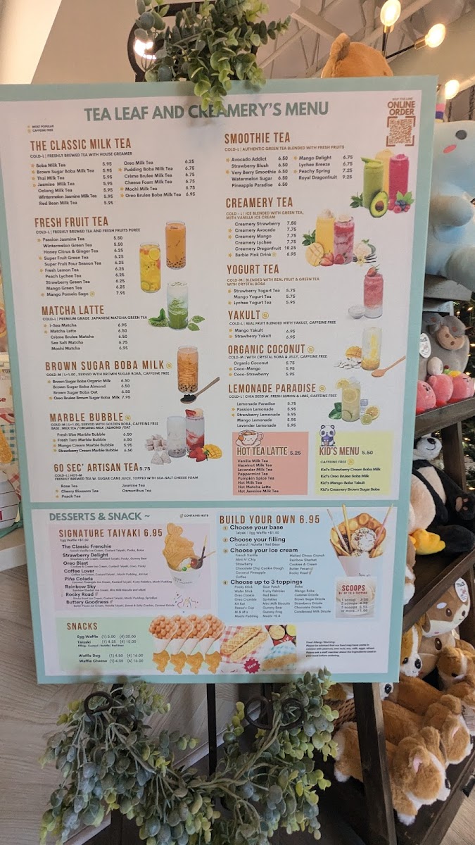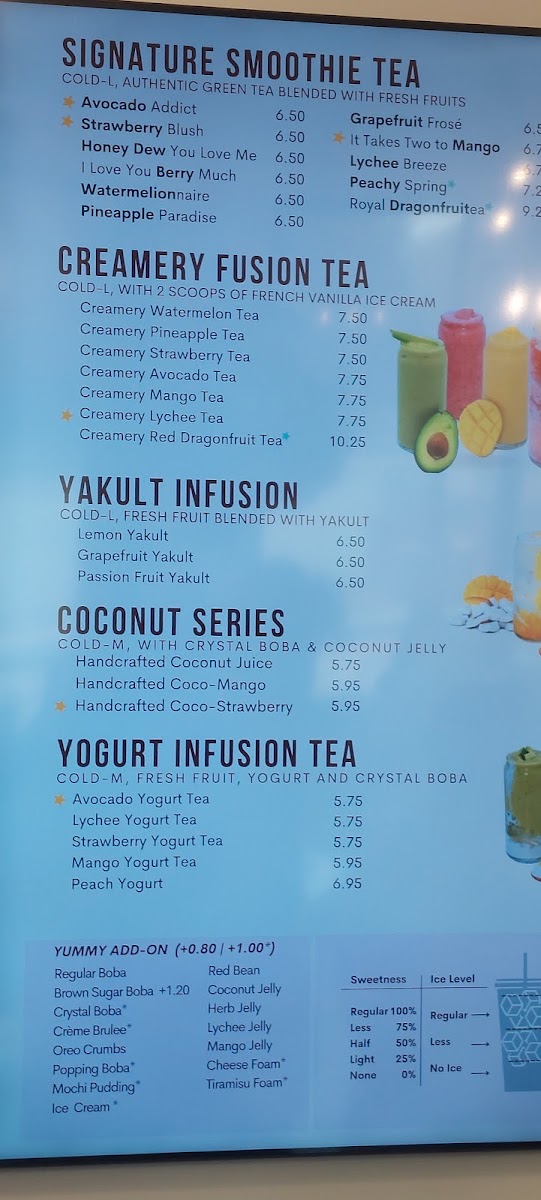 Tea Leaf And Creamery in La Verne offers a vibrant and diverse menu that effortlessly blends traditional flavors with modern twists. Their Signature Smoothie Tea selection, featuring Avocado Smoothie Tea, Grapefruit Smoothie Tea, Green Grape Smoothie Tea, Honey Melon Smoothie Tea, and Lychee Smoothie Tea, provides refreshing options for smoothie lovers. The Handcrafted Fruit Tea lineup, including Fresh Lemon Tea, Superfruit Tea, Lychee Fruit Tea, Mango Fruit Tea, and Passion Fruit Tea, showcases a bright, fruity palette. Matcha enthusiasts will find the Uji Matcha offerings such as Matcha Latte, Crème Brulee Matcha, Cheese Foam Matcha, Mochi Pudding Matcha, and Tiramisu Matcha particularly satisfying. For classic comfort, the Classic Milk Tea series-Bubble Milk Tea, Cheese Foam Milk Tea, Crème Brulee Milk Tea, Mochi Pudding Milk Tea, and Oreo Brulee Milk Tea-delivers creamy indulgence. The playful Marble Bubble drinks, including Brown Sugar Marble Bubble, Fresh Taro Paste with Bubble, Mango Marble Bubble, and Strawberry Marble Bubble, are both visually striking and flavorful. Unique options like Sea Salt Cheese Foam Tea (Cherry Blossom, Lychee, Osmanthus, Rose, and White Peach) and Yakult beverages (Fresh Grapefruit, Fresh Lemon, Fresh Orange, and Passion Fruit) add a tangy, effervescent twist. Their Ice Cream Fusion Tea-from Ice Cream Lychee Tea to Ice Cream Watermelon Tea-blends dessert and drink seamlessly, while the Coco Series, including Handcrafted Coconut Juice, Handcrafted Coco Mango, and Handcrafted Coco Strawberry, offers a tropical escape. With options for Ice, Sugar, and Extra Toppings, Tea Leaf And Creamery lets customers personalize every sip, creating a menu that is as customizable as it is flavorful, making it a standout destination for tea aficionados in La Verne.